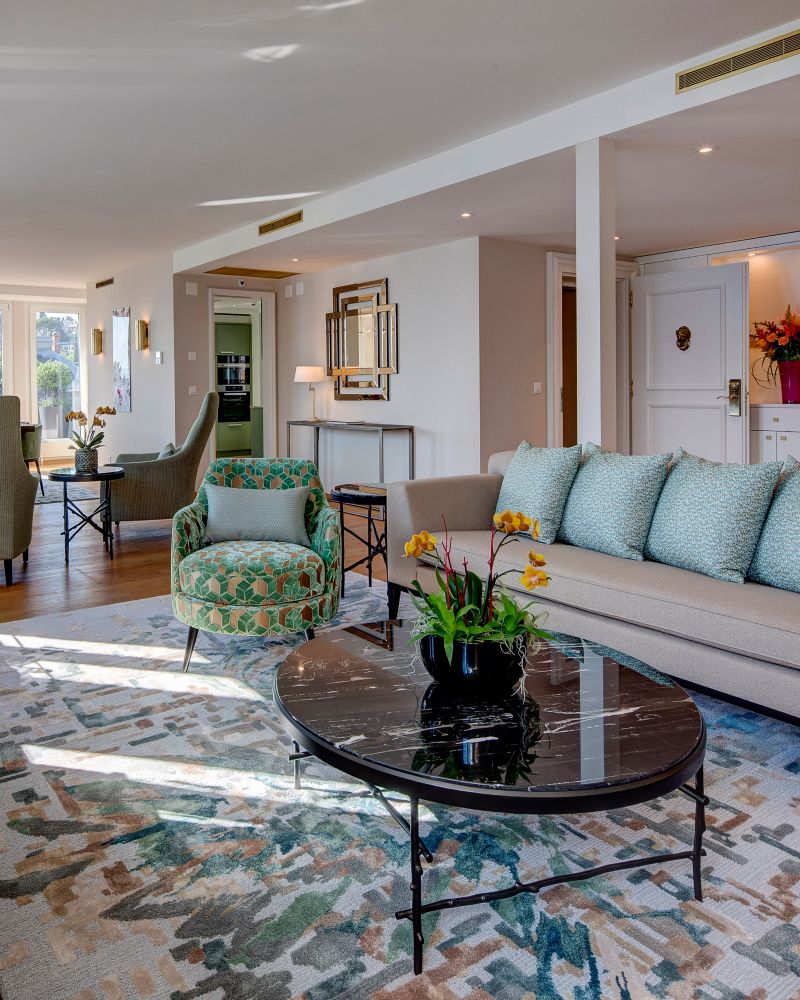VOIR LES TARIFS VOIR LES DÉTAILSTraditional suite with separate living room in a luxurious decor. Features a spacious marble bathroom, a large terrace overlooking Lake Leman and the Alps, and in-suite iPad directory.