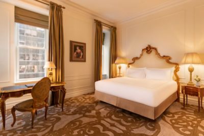 Plaza Kings are located on floors 5-19 and provide elegant accommodations with a comfortable sitting area. Each of these exceptional New York City hotel rooms features a bathroom finished with inlaid "earth stone" mosaics in floral motifs, with a bathtub as well as separate shower. Bathroom details include 24-carat gold plated Sherle Wagner faucets and accessories, and hand crafted solid white marble vanities.