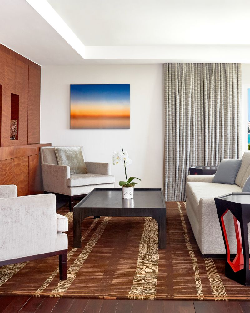 Au 3e étage de la Grand Tower, cette suite comprend une terrasse avec vue sur l'océan et la piscine, un petit salon, une salle à manger et une chambre avec un lit king size. Contactez-nous pour plus d'infos sur les options de connexion.