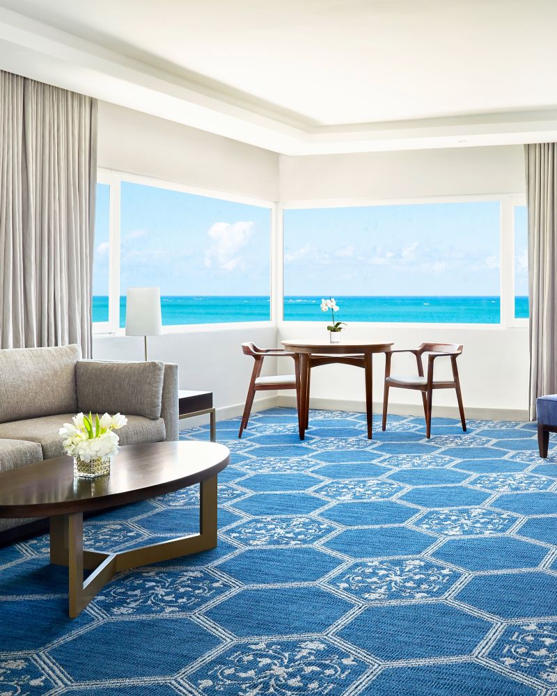 Au 3e étage de la Grand Tower, cette suite comprend une terrasse avec vue sur l'océan et la piscine, un petit salon, une salle à manger et une chambre avec un lit king size. Contactez-nous pour plus d'infos sur les options de connexion.