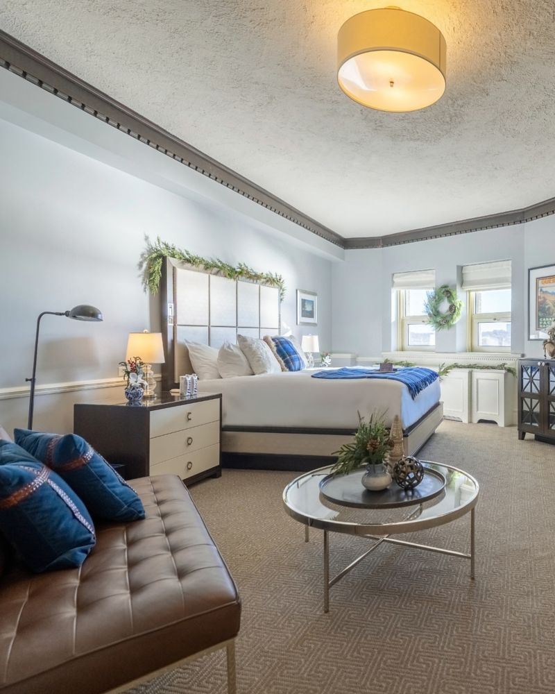 Suite Premium au dernier étage avec accès privé. Décor d'inspiration Roosevelt, grande chambre, salon et salle à manger. Luxueux bain de marbre, vue sur le vieux Québec. Comprend un service de majordome.