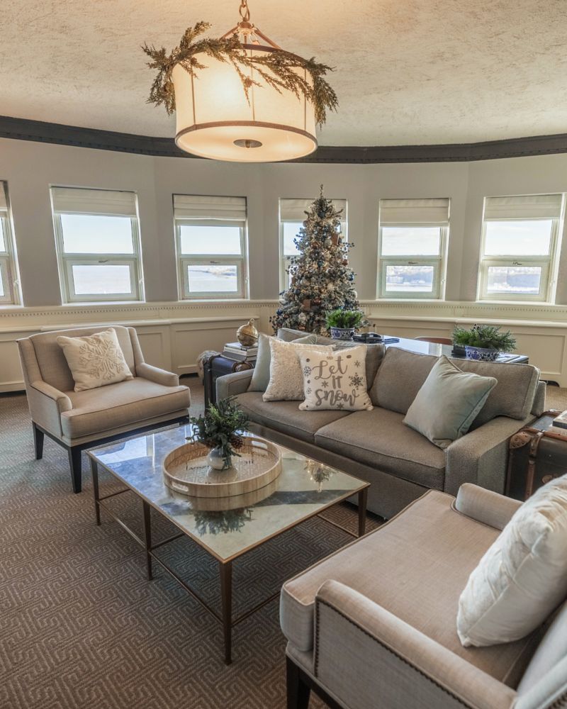 Suite Premium avec décor d'inspiration Céline Dion, chambre principale avec baignoire en marbre, salon luxueux. Point de vue sur le majestueux fleuve Saint-Laurent. Comprend un service de majordome