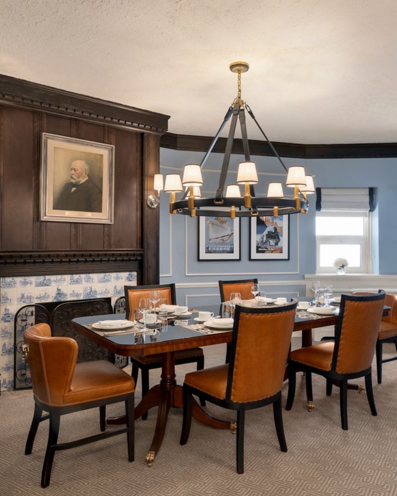 Hébergement haut de gamme inspiré par la vie de Chuchill, grand salon et salle à manger, salle de bains en marbre spectaculaire, avec baignoire et douche, salle d'eau. Vue sur le fleuve.