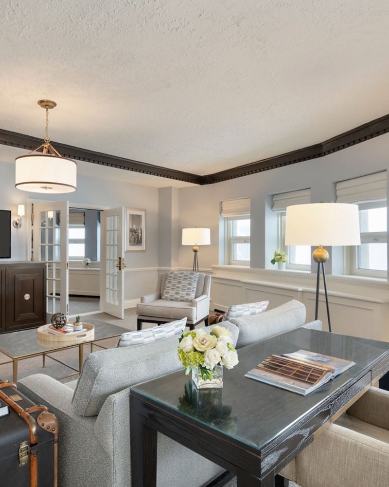Suite Premium avec décor d'inspiration charles de Gaulle, chambre principale, salon spacieux et salle à manger, baignoire luxueuse en marbre. Vues sur le fleuve Saint-Laurent.