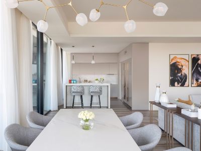 La Suite Présidentielle de 197 m² offre 2 chambres avec lit king size et 1 chambre avec lits jumeaux, un grand espace de vie, une salle à manger spacieuse et 4 salles de bain. Elle dispose d'une cuisine entièrement équipée et d'un espace de rangement.