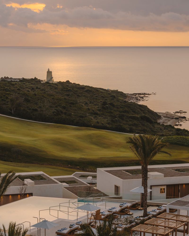 Chambre élégante et bien aménagée, avec terrasse privée offrant une vue panoramique sur les parcours de golf, un salon confortable et une salle de bain en marbre