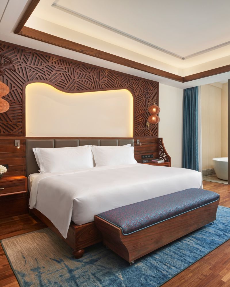 Chambre de 65 m² aux étages 2 à 3, avec douche à effet pluie et baignoire, minibar, coffre privé, sculpture bois chinoise traditionnelle, TV LCD 140 cm, WIFI gratuit, grandes baies vitrées et balcon privatif. (Lit d'appoint sur demande.)