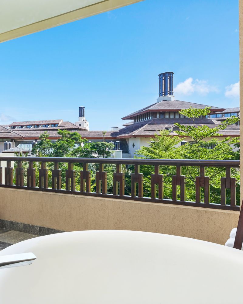 All rooms have balconies which may look upon the tropical gardens hiding more architectural relics in the resort.