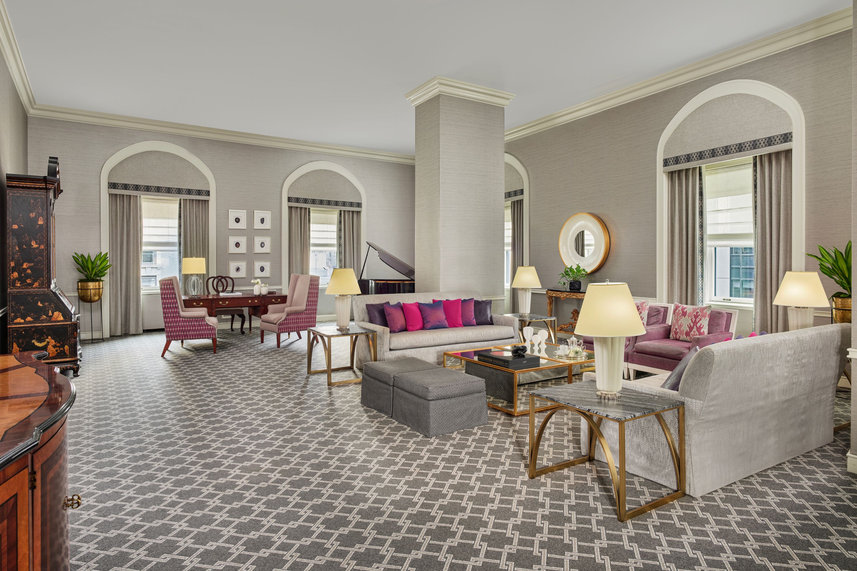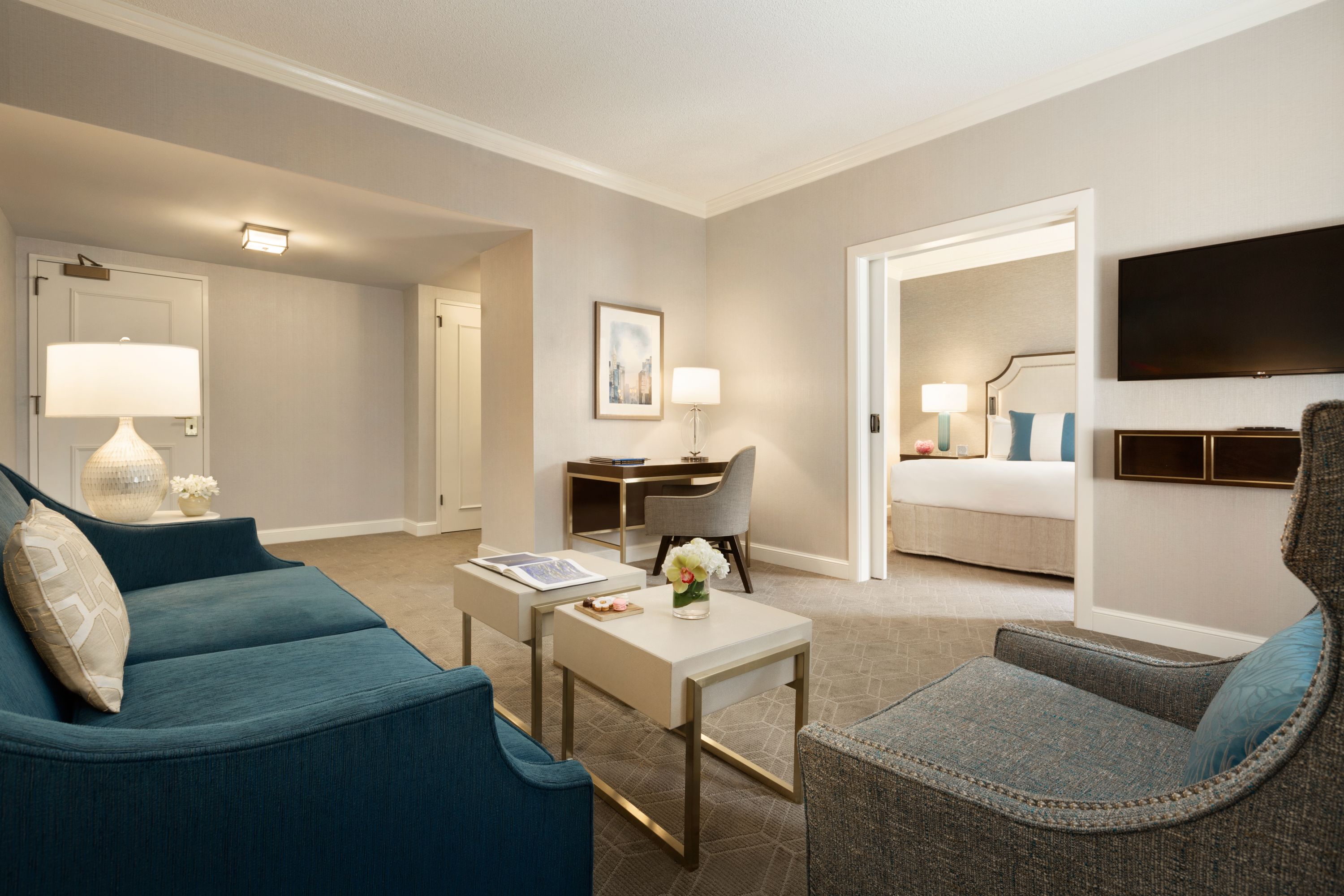Our Signature Grand One Bedroom Suite spans 1,250 square feet, and offers city and partial water views from the top floor. It features a king bedroom, dressing area, two marble baths, and signature amenities. The living room with wing-back chairs, sleeper-sofa, Murphy bed, and dining table is ideal for families or business seeking separate spaces.