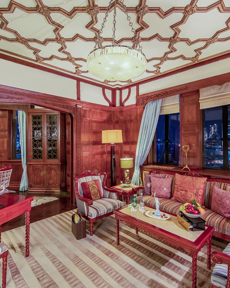 Room 520, there is filigree plaster work on the walls, ceilings from which hang extravagant pendant lights and rich Indian carpets on the floor. The suite has a living room, dining room, bedroom and bathroom.