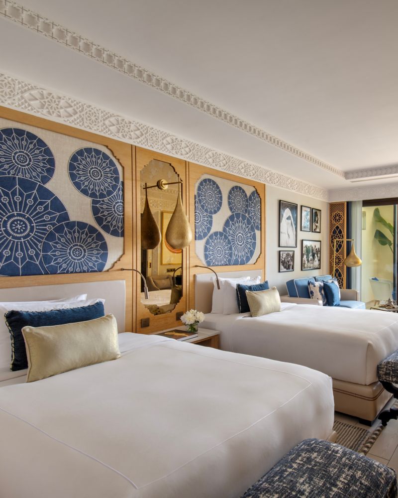 Superbe suite d'une chambre avec vue panoramique comprenant une chambre et un salon séparés, avec des designs contemporains mélangeant décor marocain traditionnel et couleurs méditerranéennes, une salle de bains en marbre et un grand balcon privé.