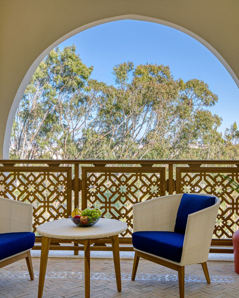 Superbe suite d'une chambre avec vue sur la forêt comprenant une chambre et un salon séparés, avec des designs contemporains mélangeant décor marocain traditionnel et couleurs méditerranéennes, une salle de bains en marbre et un grand balcon privé.