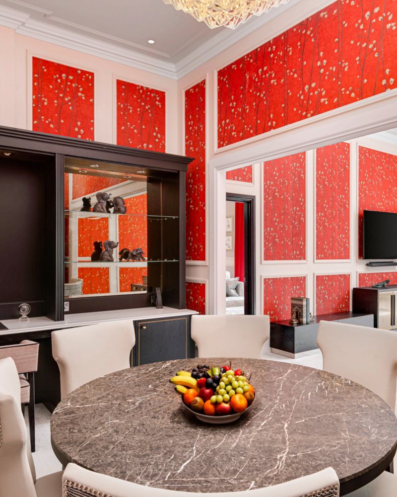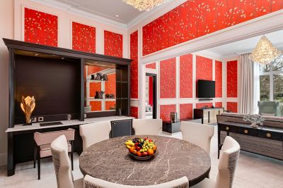 Each beautifully appointed suite features a living room and a dining space, a cocktail bar, a desk working area, a separate bedroom with king sized bed, a dressing area and a luxurious bathroom.