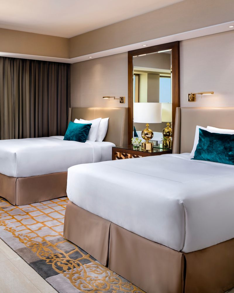 Our Arabian inspired fairmont room features a twin bed overlooking the partial views of the Arabian Gulf