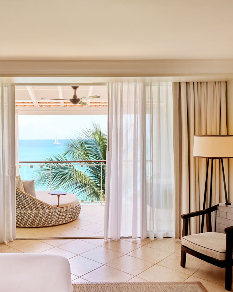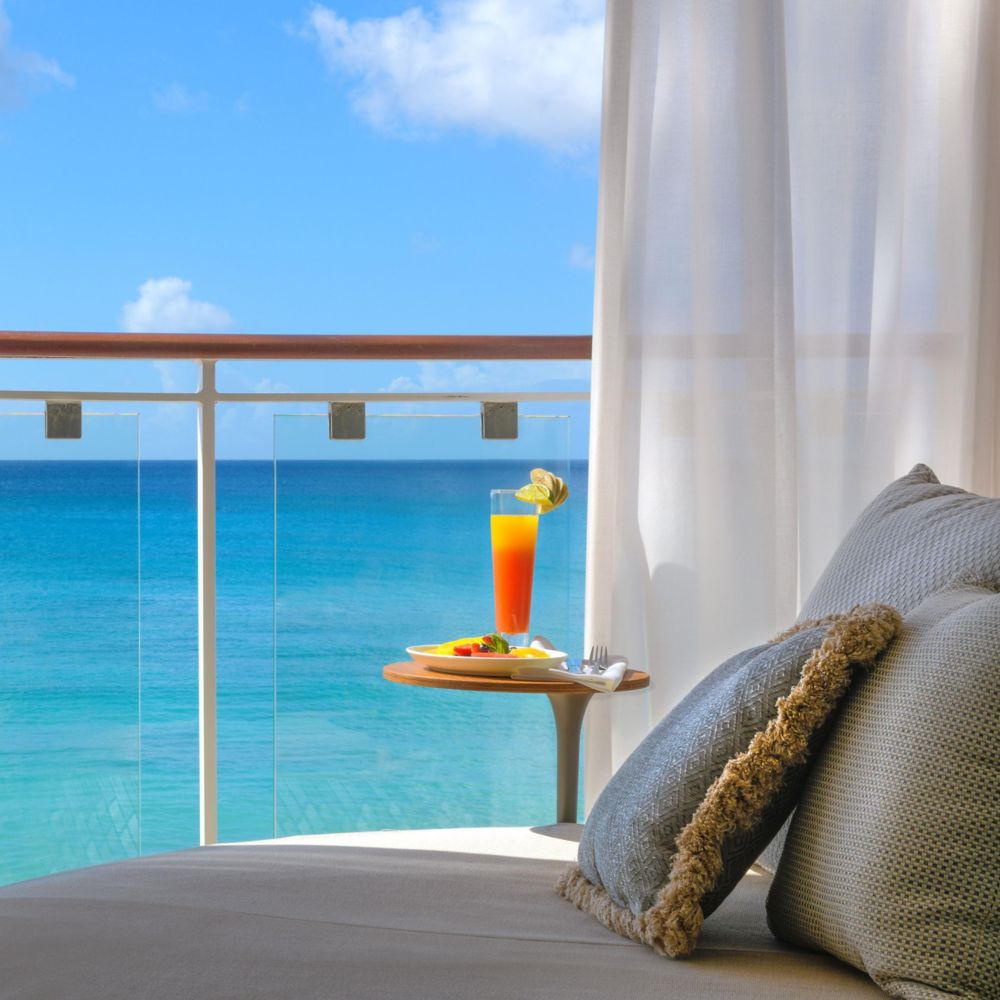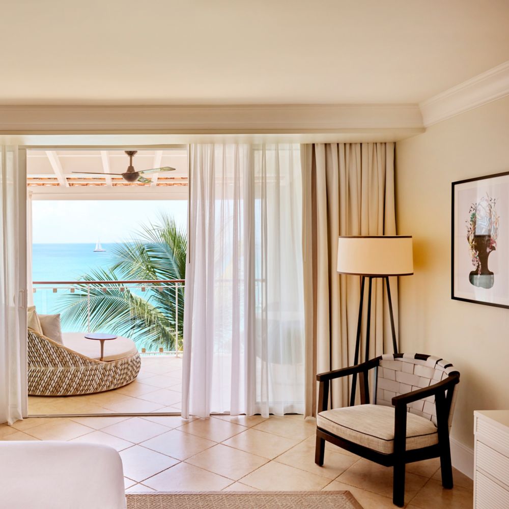 Conveniently situated on the third floor of the resort, our Signature Oceanfront Rooms offer a stunning panorama of Alleyne’s Bay beach and the expansive ocean and sky. Enjoy the breathtaking views from the spacious, glass-fronted balcony, elegantly appointed with an outdoor ceiling fan, sun loungers, and a table with chairs.