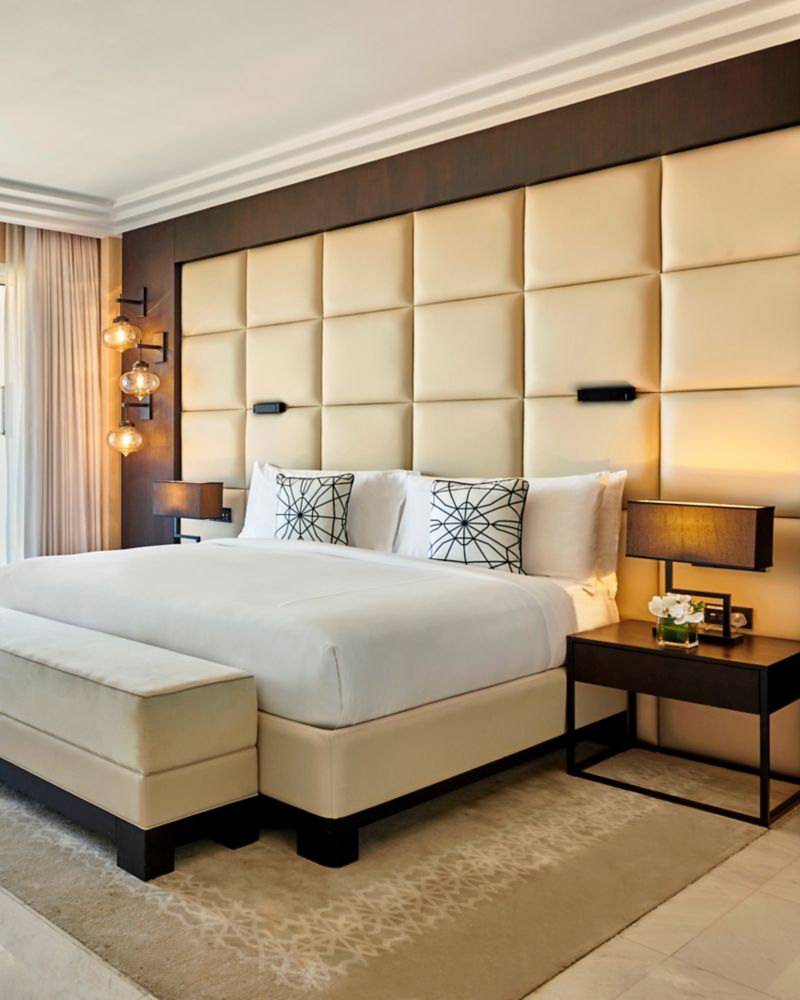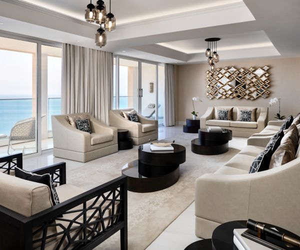 Generously spread across 360 sq m, the Royal Suite occupies the entire topmost level of our mountainous hideaway. Enveloped by stunning panoramic vistas of the Gulf of Oman and the picturesque marina, the lavishly furnished three bedroom suite features an enlarged living area, kitchen and dining room and plenty of lounge space.