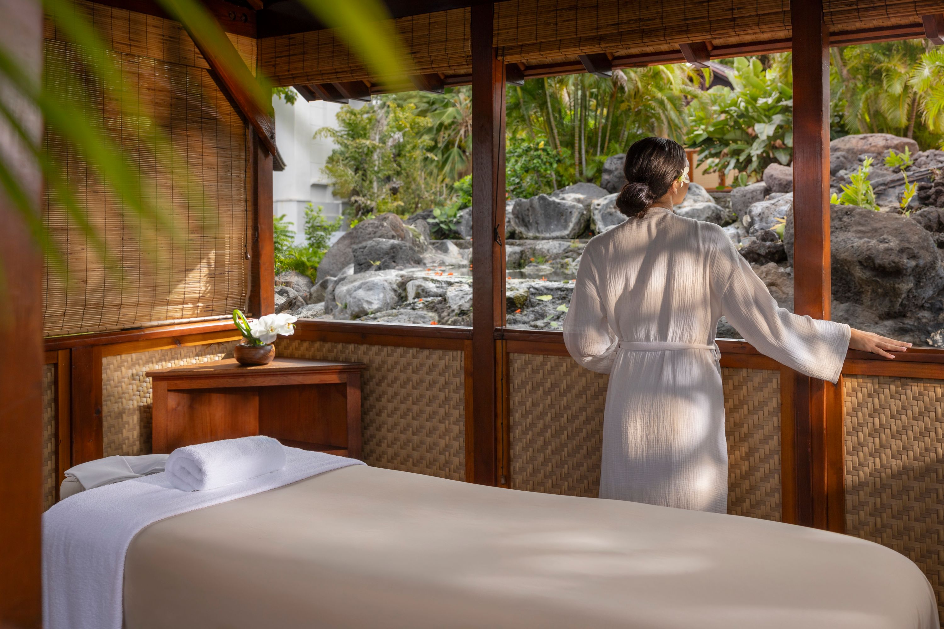 Indulge in Hawaiian-inspired massage treatments in an open-air oceanfront cabana or private waterfall hale (hut) flanked by koi ponds and a tropical landscape.
