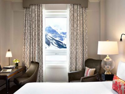 Guest Room with 1 King Bed Featuring Spectacular Views of Lake Louise & Victoria Glacier. Ideal Accommodation for a Couple or Individual. 230 ft² / 21 m².