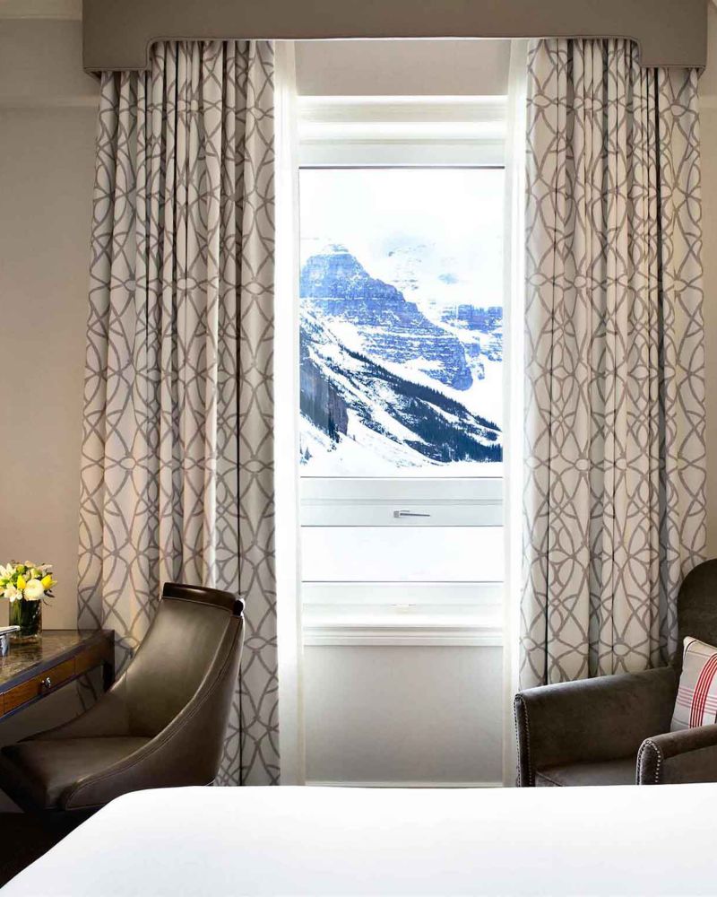 Larger Guest Room with 1 King Bed Featuring Spectacular Views of Lake Louise & Victoria Glacier. Ideal Accommodation for an Individual or Couple. 370 ft² / 34 m².