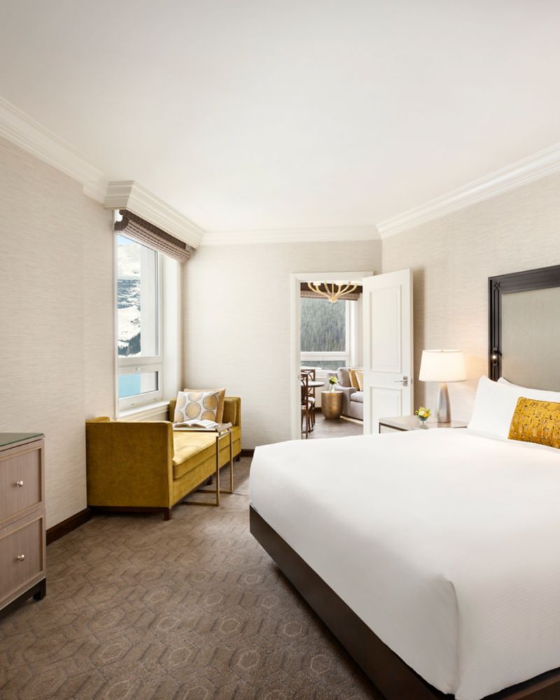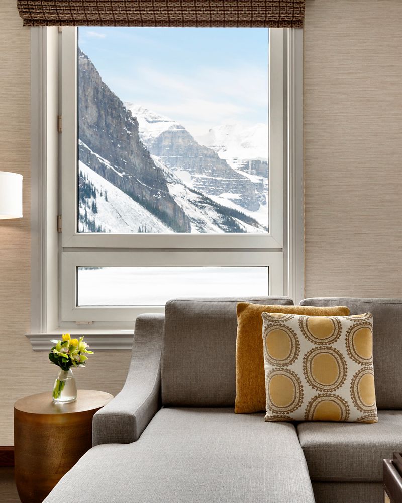 Signature Suite on Fairmont Gold with Dramatic Views of Lake Louise & Victoria Glacier. Floor to Ceiling Windows. Spacious Living Room. 1 King Bed, 1 1/2 Bathrooms. 750 ft² / 69 m².