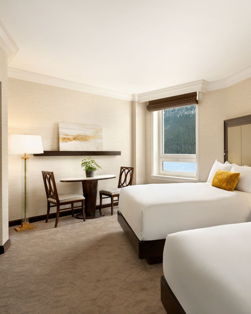 Larger Guest Room with 2 Queen Beds Featuring Spectacular Views of Lake Louise & Victoria Glacier. Ideal Accommodation for a Couple or Family. 370 ft² / 34 m².