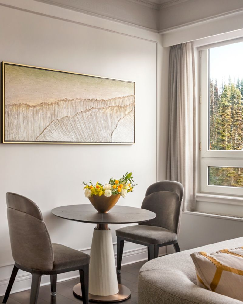 Split Level Signature Suite with 2 Terraces Offering Sweeping Views of Fairview Mountain, Bow Valley & Partial Lakeview. Access to Fairmont Gold Amenities. 1 King Bed, 2 Bathrooms. 870 ft² / 80 m².
