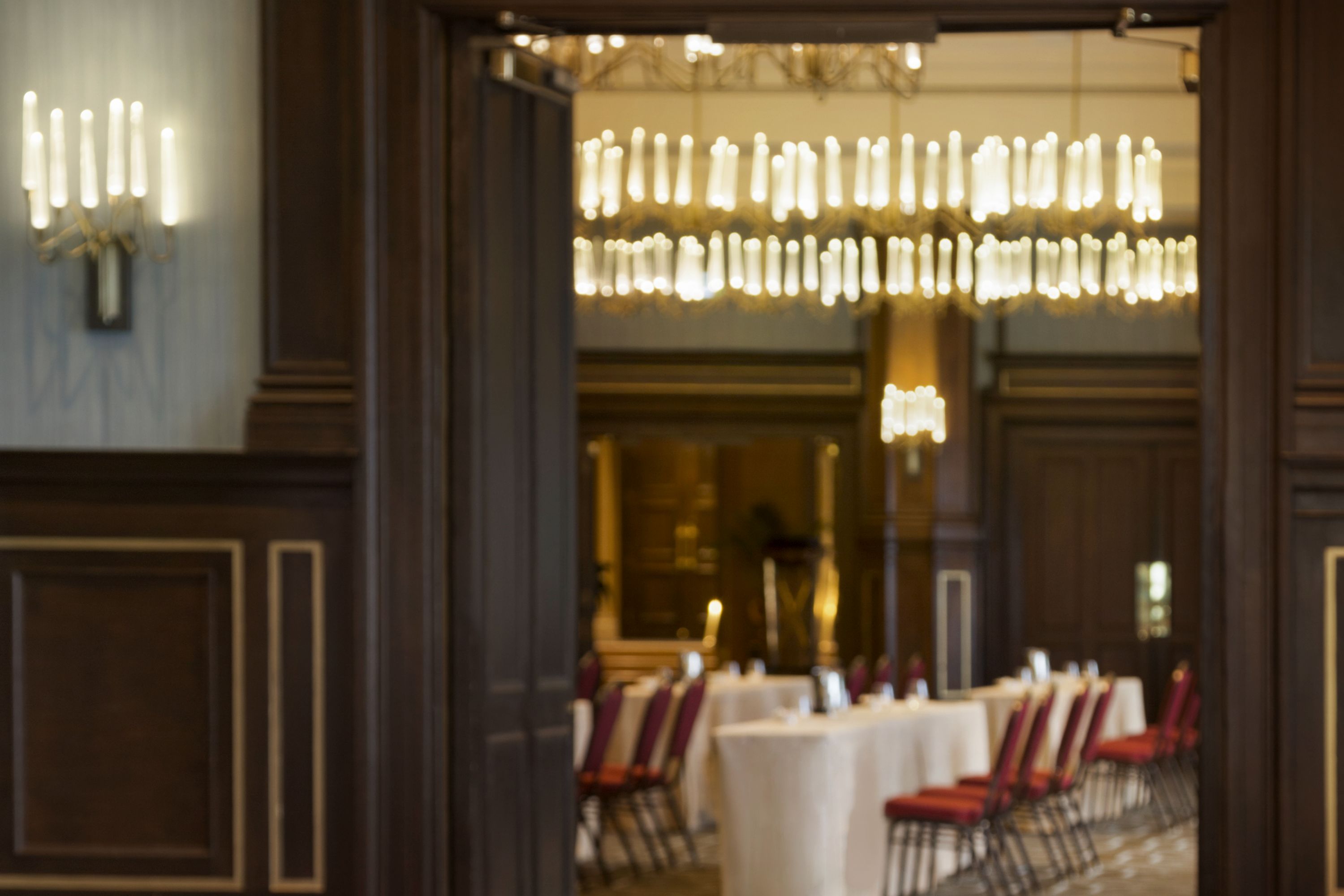 The Frontenac Room is a grand room with high ceilings, a large decorative fireplace and dark wood moldings. The magnificent chandeliers placed in rows are unique. They are reminiscent of icicles and contrast beautifully with the classic feel of the room.