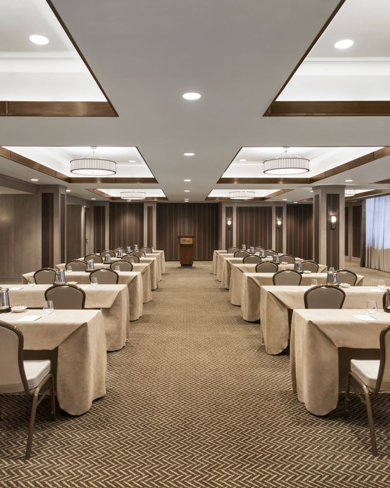 Located on the terrace level, the Montmagny room is divided into two sections for maximum flexibility. With its large windows overlooking Saint-Louis Street, it benefits from abundant natural light. With its tapestry reminiscent of a pinstripe jacket, its timeless decor is the perfect backdrop for your event.