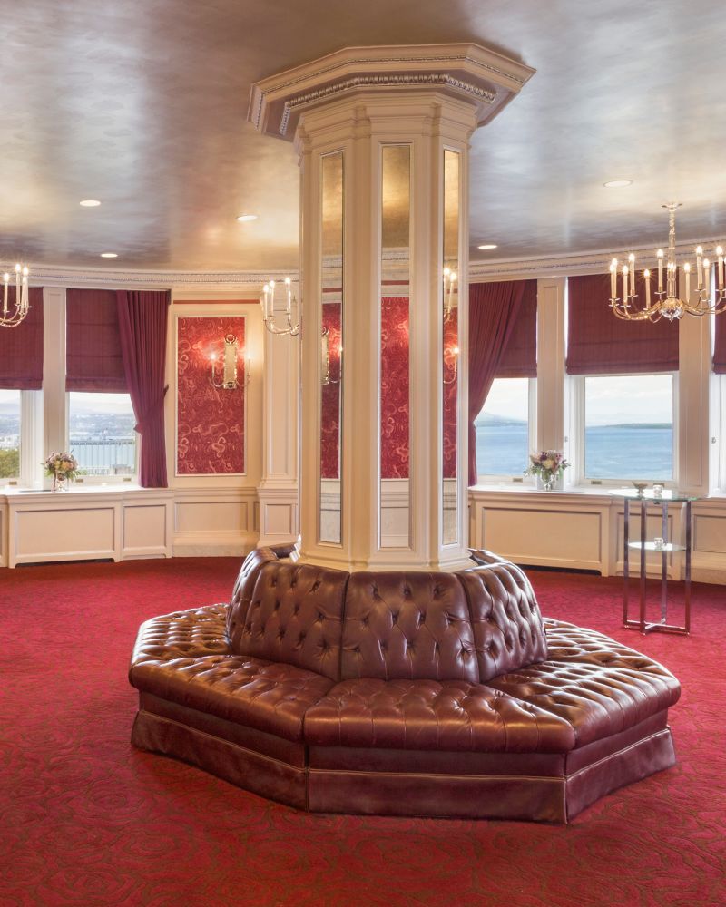 With its chandeliers, moldings and two decorative fireplaces, the famous Salon rose is a reflection of the elegance and glamour of the Château. Located in the main turret of the Château, this one-of-a-kind function room offers a spectacular view of the St. Lawrence River, Old Québec and the Dufferin Terrace.