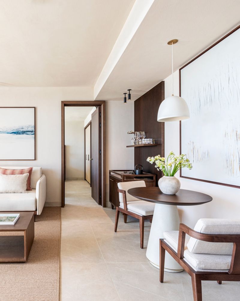 Elegant and spacious, Mediterranean interiors with a subtle combination of natural materials furniture. Room with 2 Queen size beds, an integrated lounge, a marble bathroom and a refreshing terrace overlooking the inviting poolside.