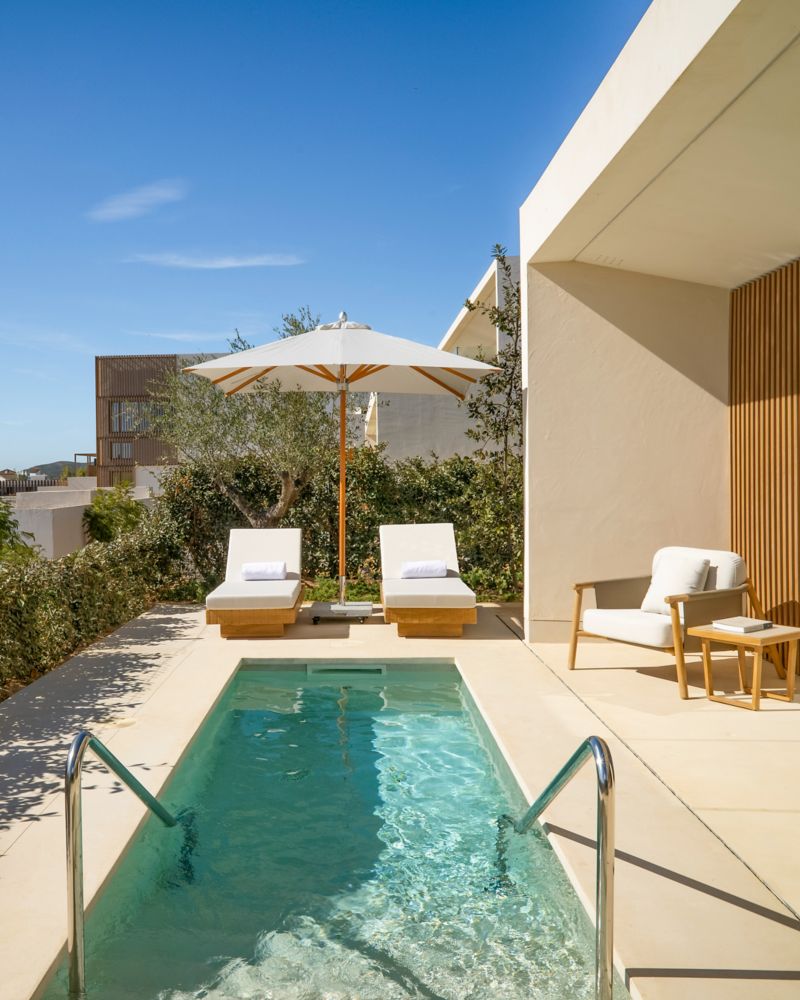 Elegant and spacious, Mediterranean interiors with a subtle combination of natural materials furniture. Room with 1 King size bed, an integrated lounge, a marble bathroom and a refreshing terrace overlooking the inviting poolside.