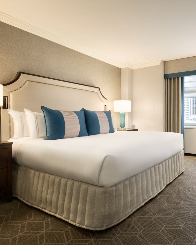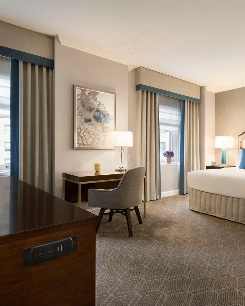 Intimate and well-appointed, Fairmont King 350- 420 square foot guest rooms offer an ideal haven for business travelers. Enjoy a modern, cozy bedroom, an en-suite marble bathroom, and a productive workspace featuring connectivity, USB outlets, and ample natural daylight with either a city or courtside view.