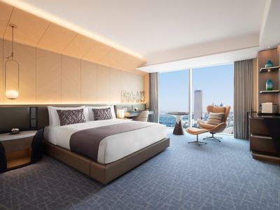 ホテルの上層階から素晴らしい景色をお楽しみいただけます。エレガントな内装と広い大理石のバスルームを完備しております。深いリラクゼーションをお探しのお客さまに最適なくつろぎスポットです。※ 客室の画像は、実際の客室と異なる場合があります。