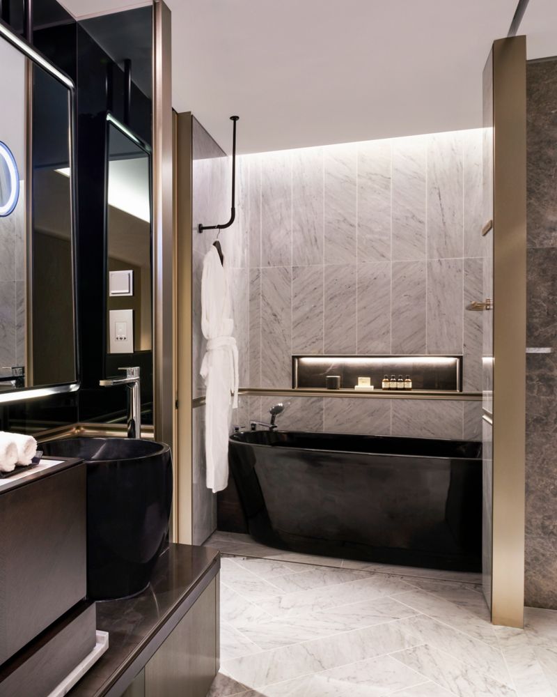 洗練されたインテリアデザインとモダンな家具がエレガントに調和したお部屋と、豪華な大理石のバスルームで、ゆったりとおくつろぎください。※ 客室の画像は、実際の客室と異なる場合があります。