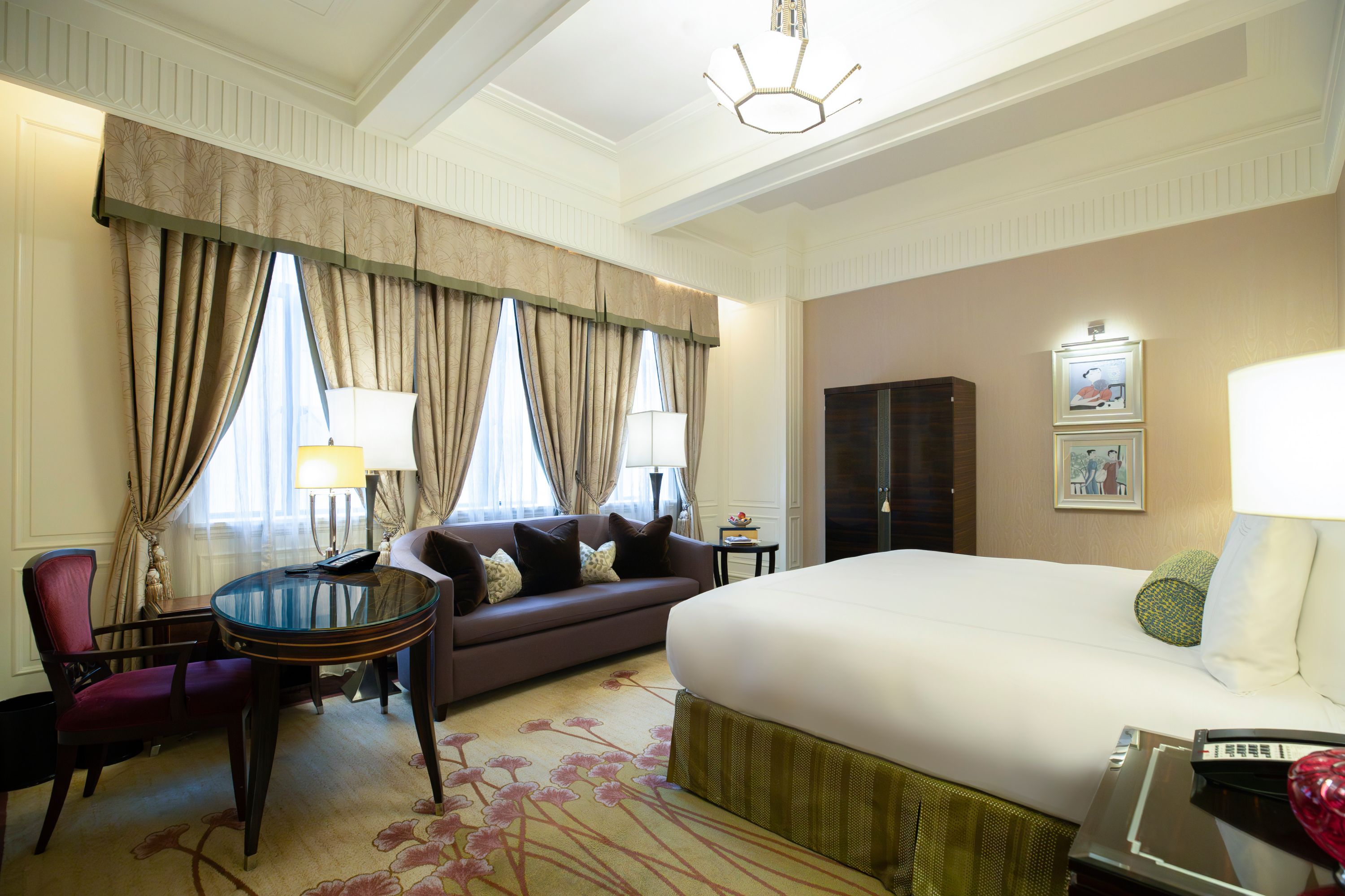 Room 719, the suite is approximately 178 sq m in size, with a spacious living room, dining room, bedroom and bathroom. The Chinese Suite is resplendent in design, colour and decorative detail, with an Imperial dragon design on the scarlet ceiling, complem