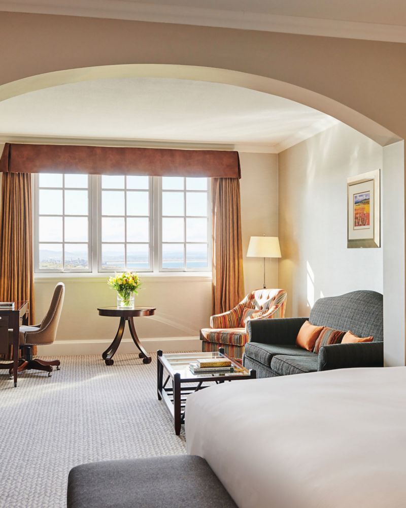 Fairmont rooms feature, one king bed, bathroom with separate shower and bathtub and enhanced views over the grounds and golf courses.