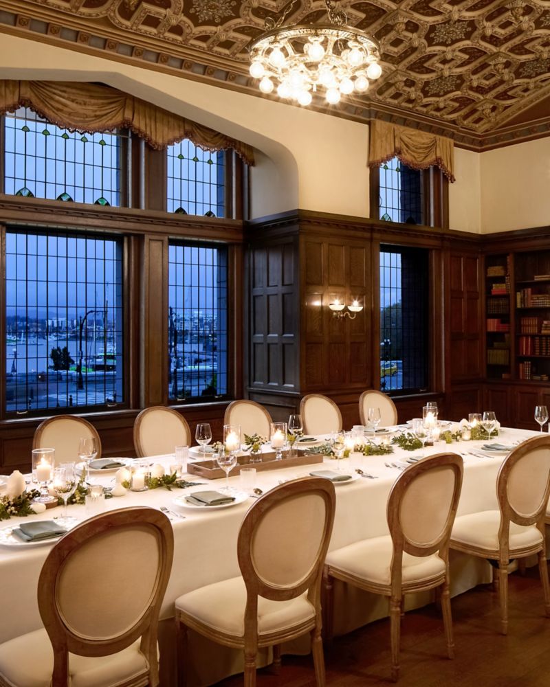 Stately and cultured, the 1900s-era Library Room channels a baronial castle. Period floor-to-ceiling windows and draperies, original wood paneling, hardwood flooring and a fireplace, accented with traditional furnishings, create an ambiance of royal opulence. Gather your intimate guest list for an unforgettable event in a storied space that’s truly extraordinary. The Library will accommodate 40 guests at a standing reception and 10-40 guests at a seated dinner.