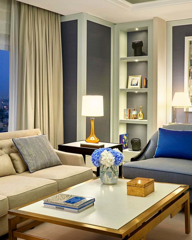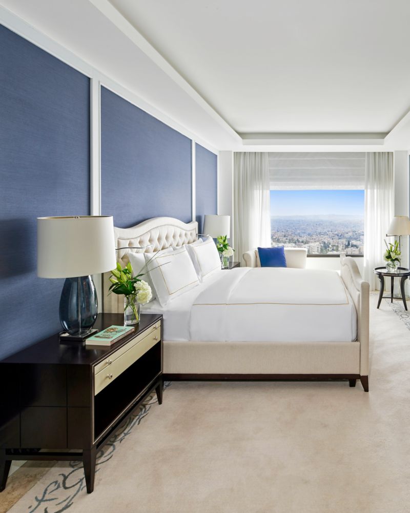 安曼皇家套房配备特大床,坐拥城市天际线全景视野,该豪华套房内设有独立的起居室和餐厅、私人办公区,入住即可尊享费尔蒙金尊酒廊专属礼遇,免费使用水疗中心的设施。