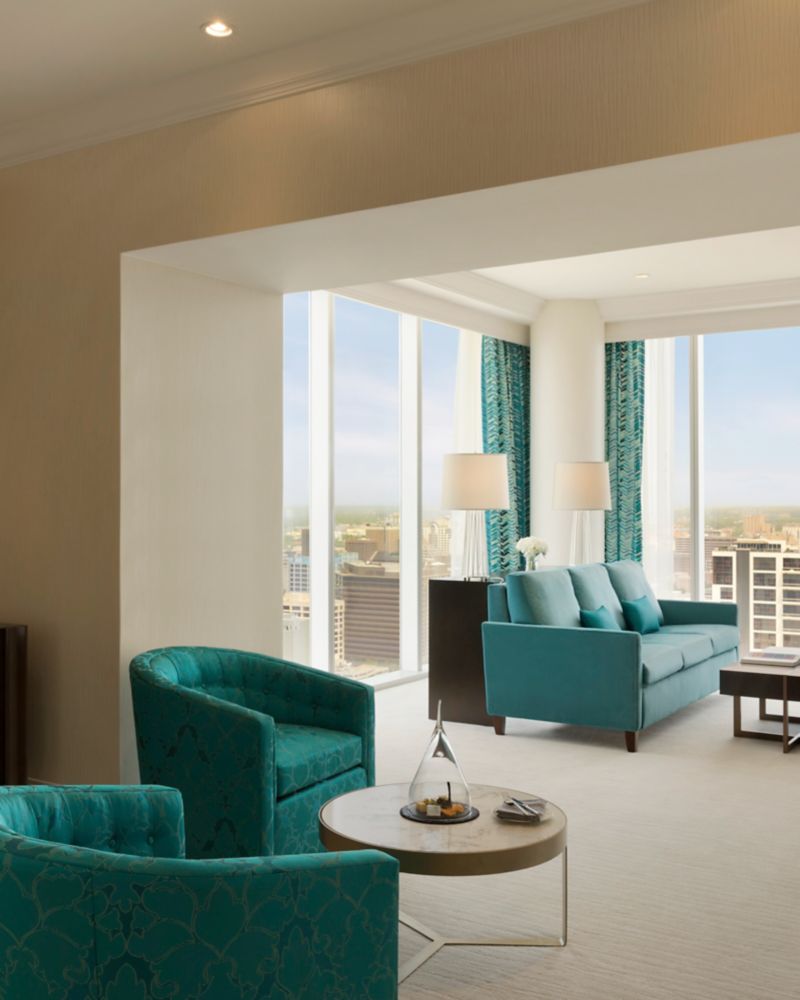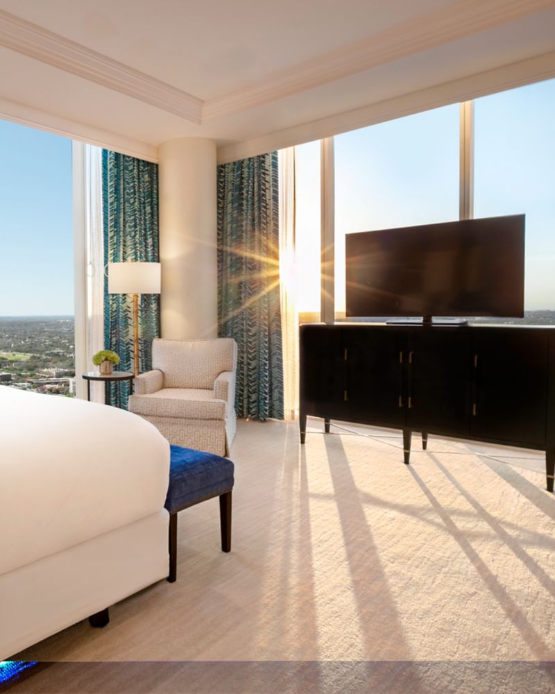 Presidential Suites are an expansive 1,640 square feet and feature panoramic views of Austin’s spectacular skyline. Each suite highlights a variety of premier amenities such as a large wet bar with a separate refrigerator and microwave, two luxurious bathrooms and a private fitness space complete with a Peloton bike, weights, elastic bands and a TV.