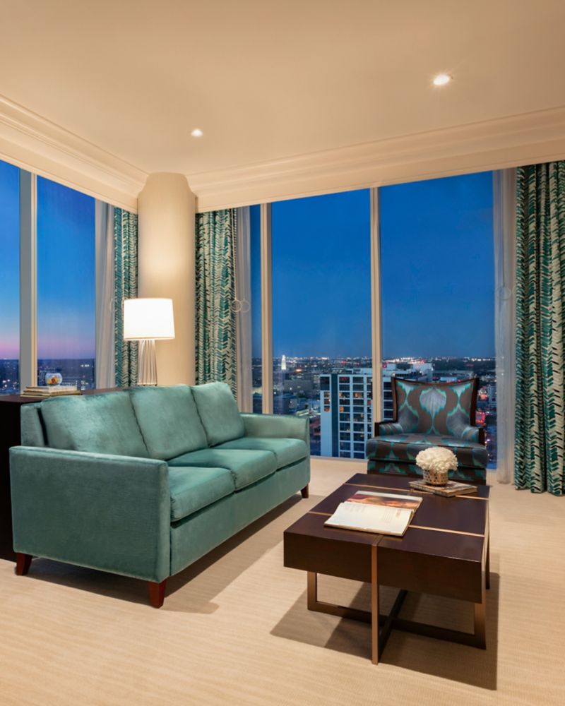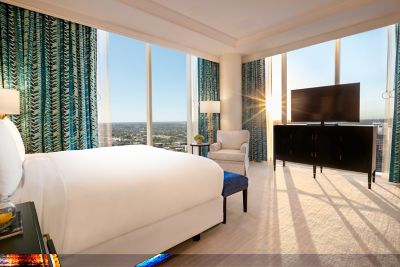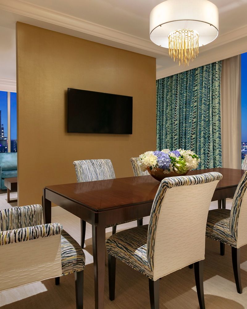 客房可欣赏天际线美景,配备起居室、餐厅、2 间浴室、办公室、调酒柜桌、豪华洗浴用品、可视警报器和通知设备、调整过高度的窥视孔和门铃,可按要求连通客房。