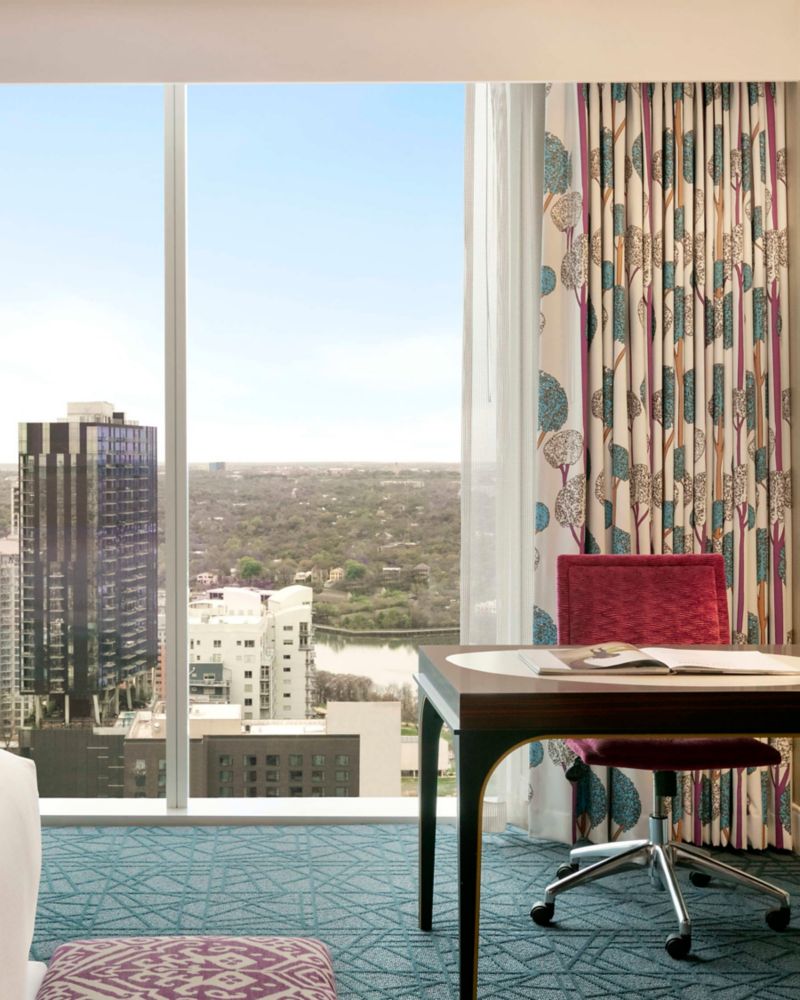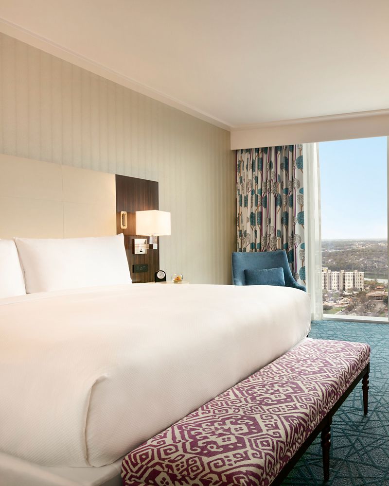 客房可欣赏天际线美景,配备起居室、餐厅、2 间浴室、办公室、调酒柜桌、豪华洗浴用品、可视警报器和通知设备、调整过高度的窥视孔和门铃,可按要求连通客房。