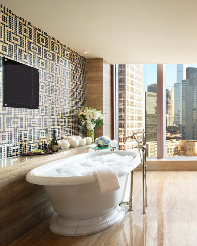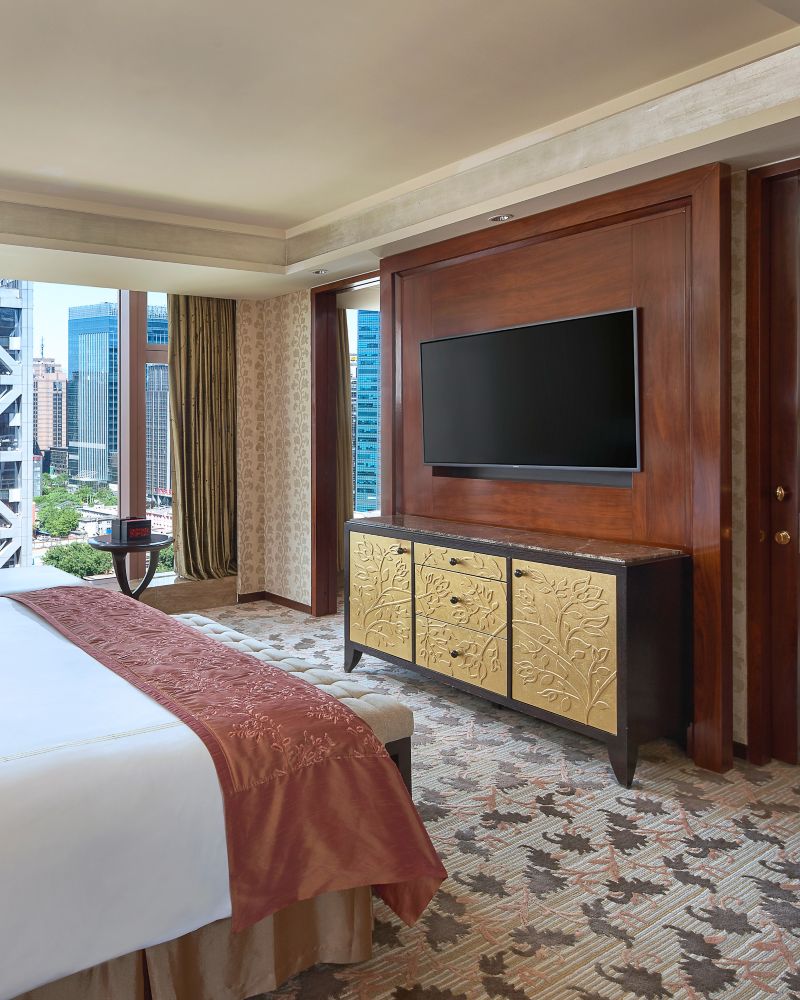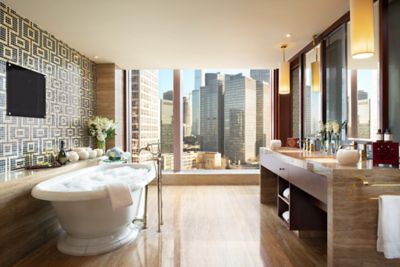 125 平方米的独享套房以意蕴悠长的东方神韵结合当地艺术品精心打造而成,并设有一张特大床,铺有 400 纱支密度的高品质床单。城市美景尽收眼底,宽敞的起居区和就餐区,尽享金色奢华装饰,如标志性的 24K 金灯雨淋式淋浴喷头和豪华沐浴用品。