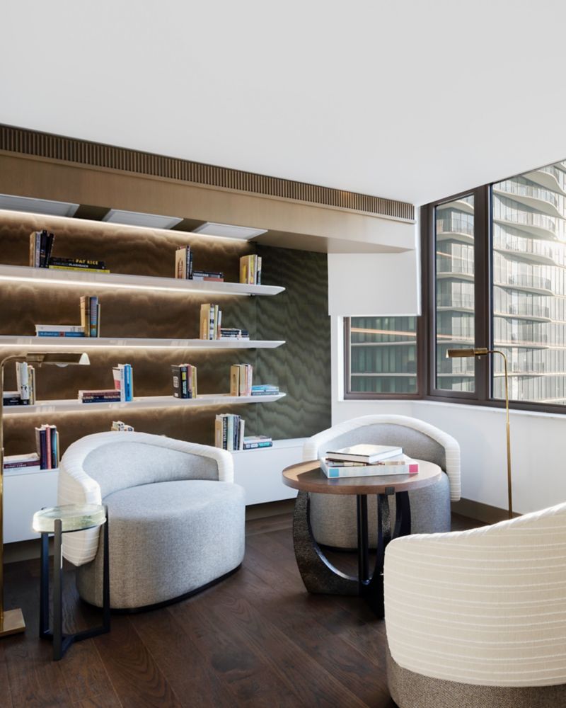 总统套房设有华丽的前厅区、起居室、餐厅、带有壁炉和大钢琴的图书室、酒吧和管家服务式餐具室以及带按摩浴缸的卧室。芝加哥天际线和千禧公园的美景一览无余。
