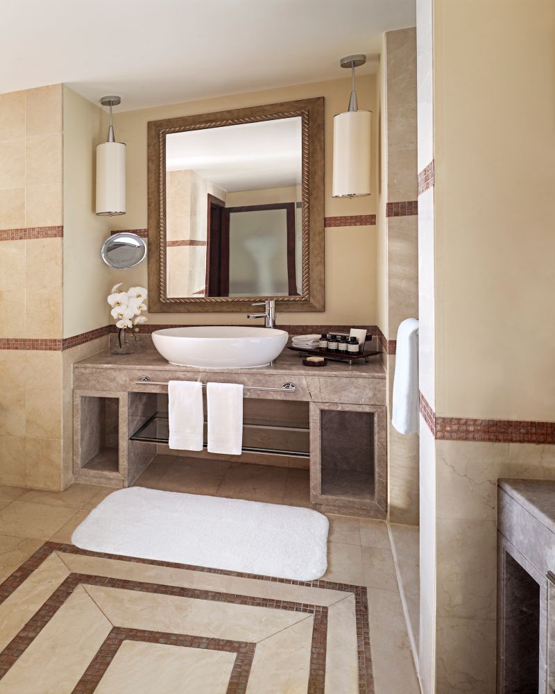 This sophisticated corner suite offers dining, seating areas as well as a private balcony with breathtaking views of the Arabian Gulf. Decorated in the colors of the sand and the sea this magnificent suite offers the ultimate relaxation.
