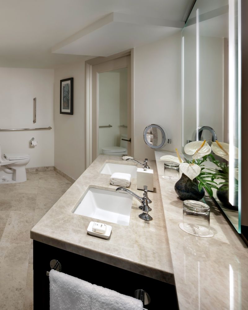 宽敞的单卧室套房融合了夏威夷风格的艺术品和设计,在宽敞的阳台上可欣赏哈里阿卡拉的美景。无障碍浴缸配有扶手杆,入口门宽 81 厘米(32 英寸),马桶侧面和后面配有扶手杆,配备步入式淋浴间和双盥洗台。