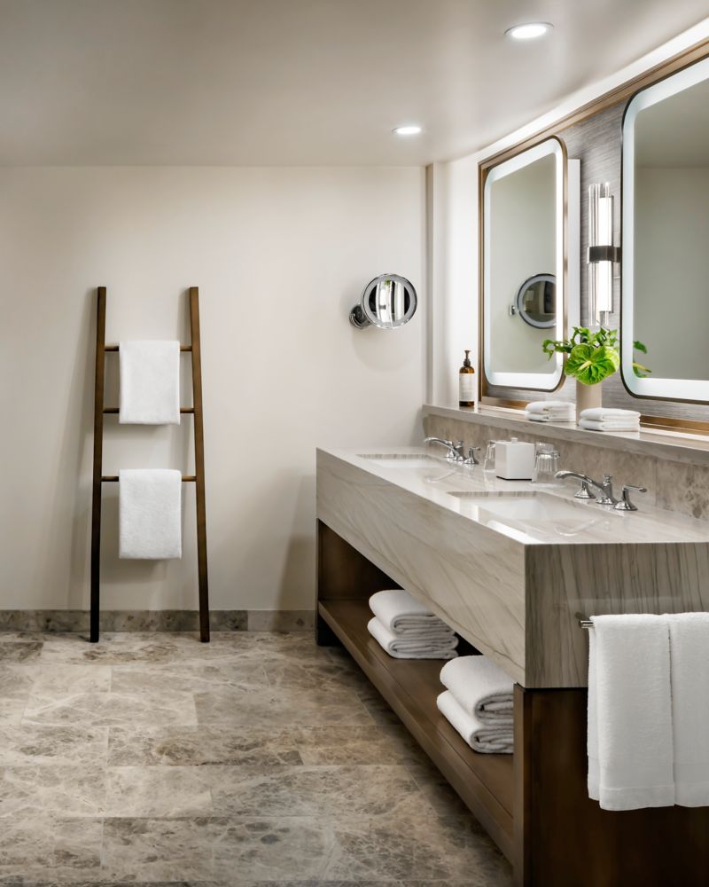 宽敞的单卧室套房融合了夏威夷风格的艺术品和设计,在宽敞的阳台上可欣赏哈里阿卡拉的美景。无障碍浴缸配有扶手杆,入口门宽 81 厘米(32 英寸),马桶侧面和后面配有扶手杆,配备步入式淋浴间和双盥洗台。