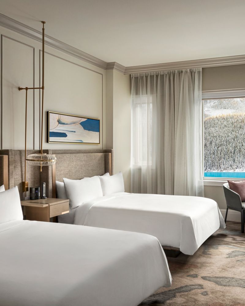 Larger Guest Room with 2 Queen Beds Featuring Spectacular Views of Lake Louise & Victoria Glacier. Ideal Accommodation for a Couple or Family. 370 ft² / 34 m².