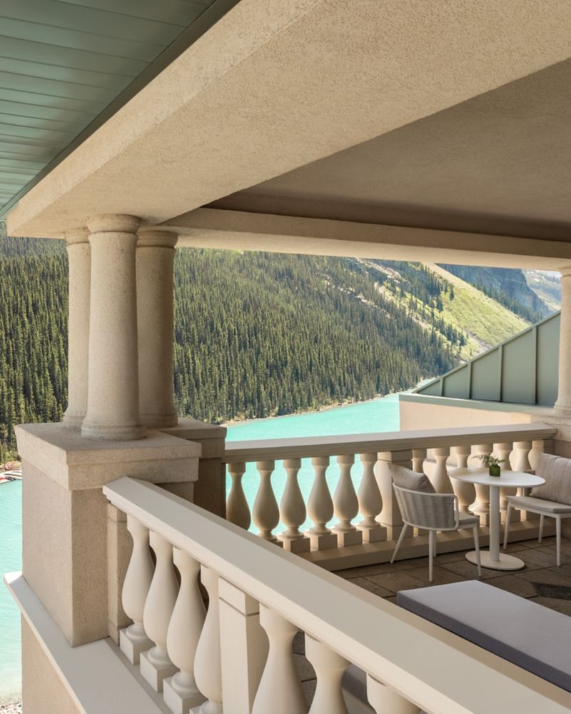 Split Level Signature Suite with 2 Terraces Offering Sweeping Views of Fairview Mountain, Bow Valley & Partial Lakeview. Access to Fairmont Gold Amenities. 1 King Bed, 2 Bathrooms. 870 ft² / 80 m².