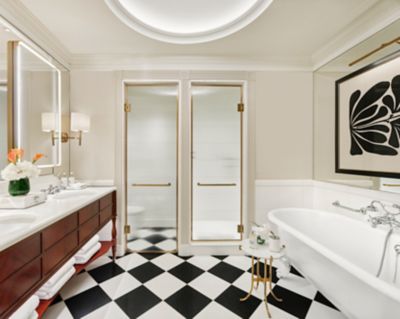 Named after some of the most famous guests ever to have stayed at The Savoy, these impressive, one-bedroom Edwardian suites are among the most spacious in the hotel. Marble entrance foyers and generous cloakroom areas lead onto the suites’ separate sitting rooms and large bedrooms, with en-suite bathrooms decorated with The Savoy’s trademark black and white chequer board flooring and featuring claw-foot bathtubs.
