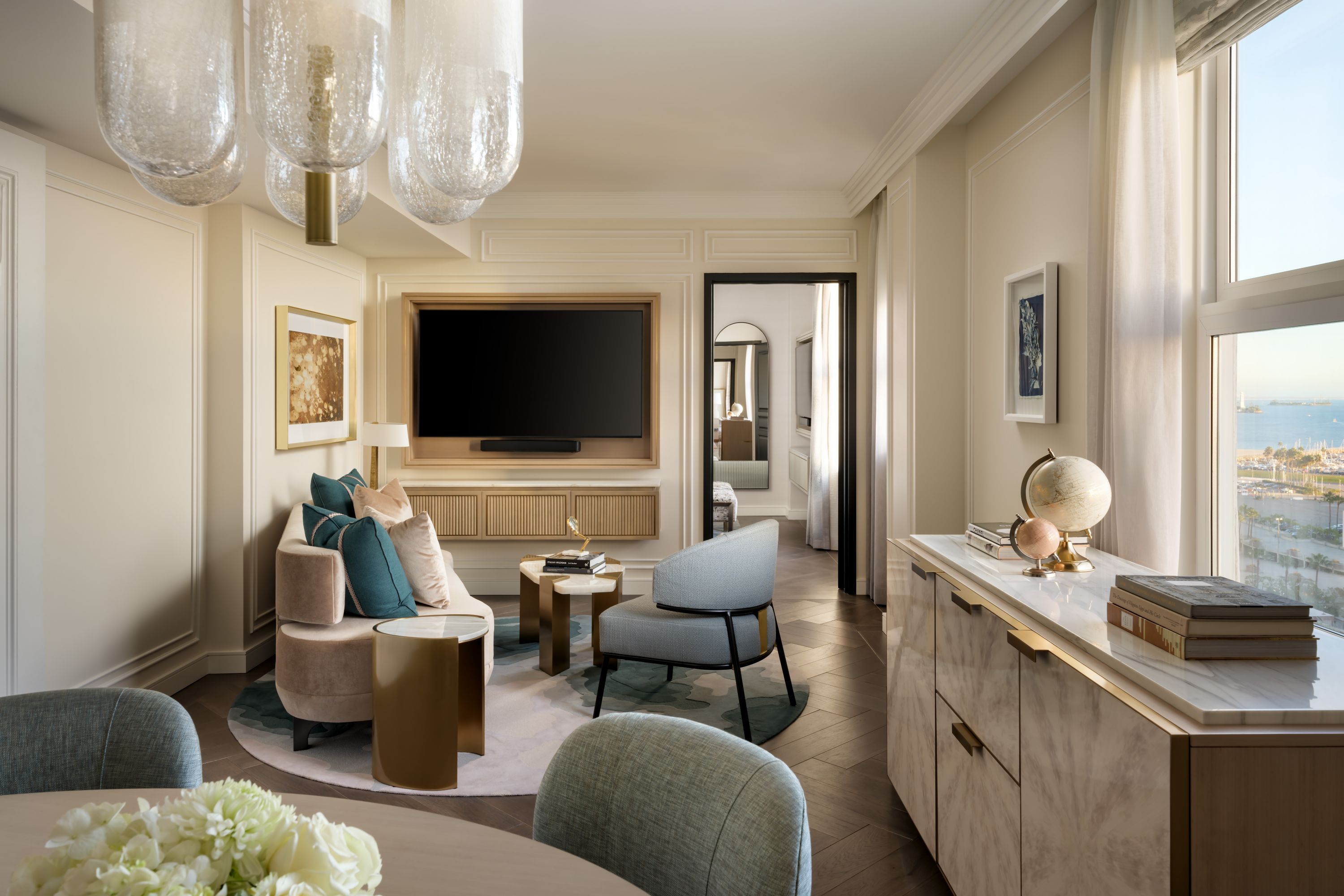 这些套房空间宽敞,十分舒适,设有独立的起居室(带指定用餐区)、带淋浴和浸泡浴缸的大理石浴室,以及带南向和东向窗户的私人卧室,可以一览无余地欣赏到海湾美景。